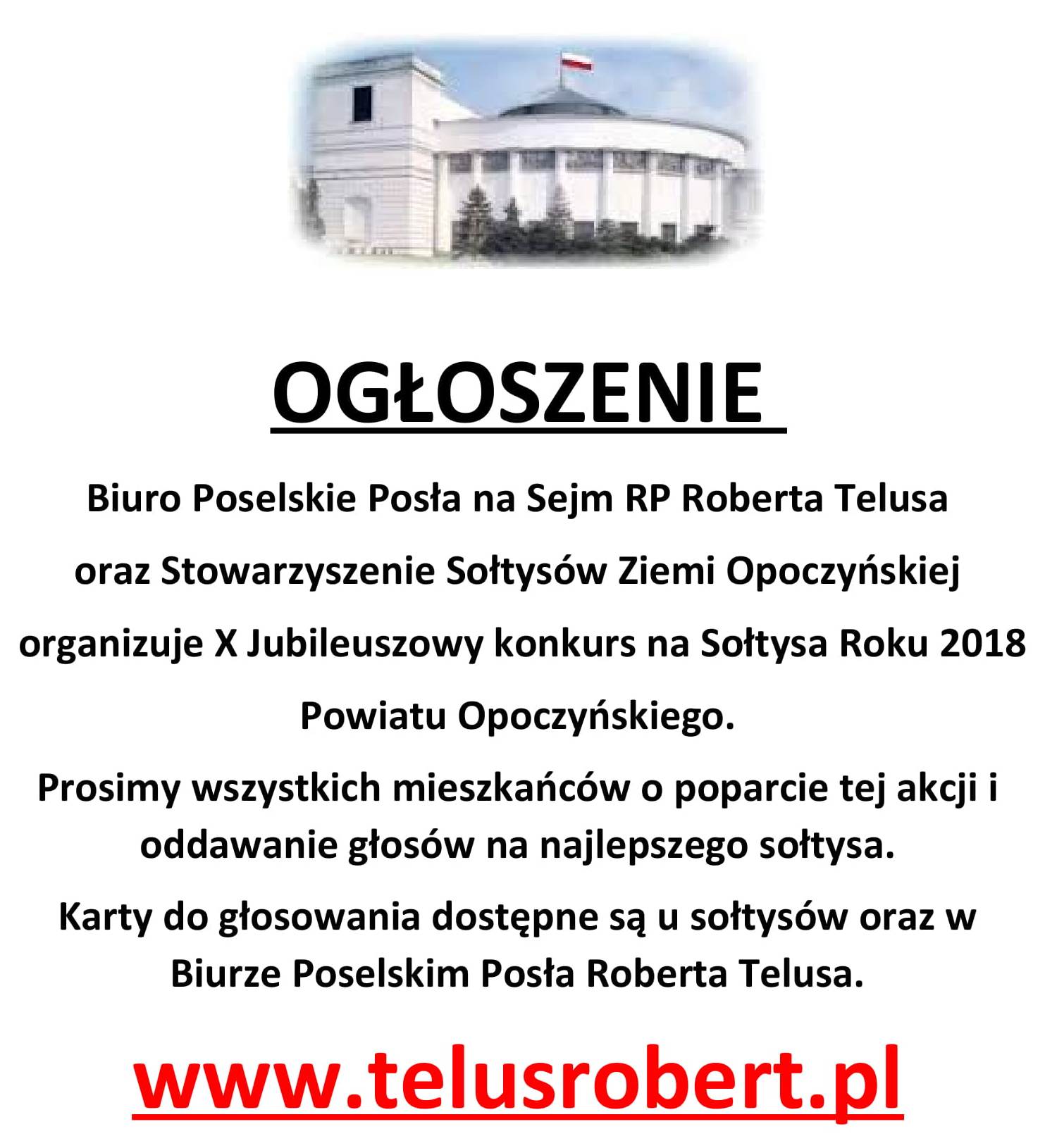 W tym roku już po raz dziesiąty zostanie wybrany Sołtys Roku Powiatu Opoczyńskiego. Organizatorami konkursu jest Biuro Poselskie Posła na Sejm RP Roberta Telusa oraz Stowarzyszenie Sołtysów Ziemi Opoczyńskiej. Oprócz zaszczytnego tytułu Sołtysa Roku zwycięzca otrzyma atrakcyjną nagrodę rzeczową. Głosy zebrane wśród mieszkańców będą także oznaką zadowolenia z działalności sołtysa i zadeklarowania dalszego poparcia.